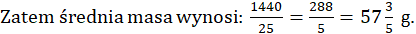 Średnia masa piłek do tenisa producenta A wynosi 57 g, a producenta B wynosi 58 g. Tenisista posiada 10 piłek od producenta A i 15 piłek od producenta B. Oblicz średnią masę piłek posiadanych przez tenisistę.