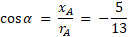 Dane są trzy punkty na płaszczyźnie: A(-5, 12), B(-6, 8) i C(-20, 21), które leżą odpowiednio na ramionach końcowych trzech kątów: α, β i γ. Dane są dwie nierówności: