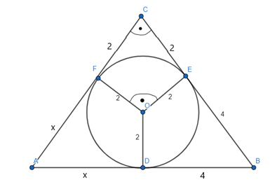 W trójkącie prostokątnym ABC, którego obwód wynosi 24 cm, wpisano okrąg o promieniu 2 cm (jak na rysunku). Dodatkowo, odcinek BE ma długość 4 cm. Oblicz obwód czworokąta ADOF.
