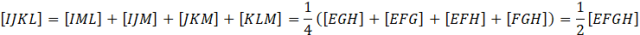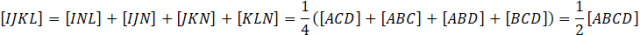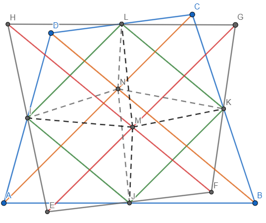 Czworokąty ABCD i EFGH mają wspólne środki boków. Łączymy te środki tworząc czworokąt IJKL (zielony). Czerwone odcinki to przekątne EFGH, zaś pomarańczowe to przekątne ABCD. Punkty przecięcia przekątnych (M i N) łączymy ze środkami boków (czyli IJKL). Odcinek IL jest równy połowie AC i połowie EG (twierdzenie o środkowej trójkąta). Analogicznie pozostałe boki IJKL. Przyglądając się trójkątowi INL widzimy, iż jego pole jest 4 razy mniejsze od pola trójkąta ACD (wysokość INL jest połową wysokości ACD, a podstawa IL jest równa połowie podstawy AC). Tak samo dla czworokąta EFGH pole trójkąta IML jest