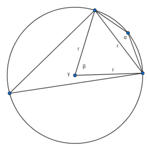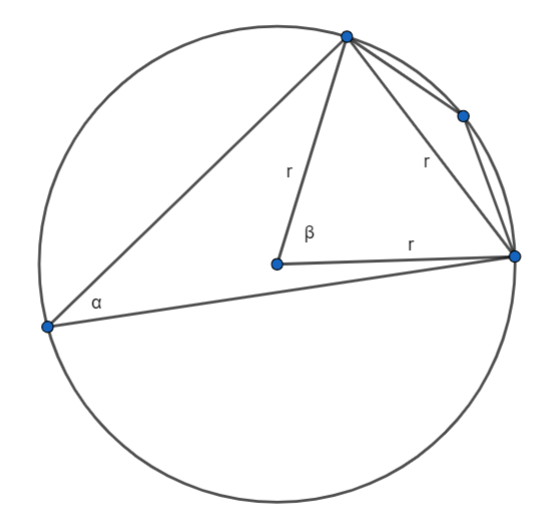 Przypadek 1: w trójkącie równobocznym miara każdego kąta wynosi 60˚. Twierdzenie o kątach wpisanych i środkowym opartych na tym samym łuku okręgu mówi, że kąt wpisany ma dwa razy większą miarę niż kąt środkowy oparty na tym samym łuku.
