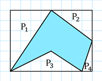 Możesz podzielić dany wielokąt na figury, których pole jesteś w stanie policzyć, a następnie je zsumować. W rozwiązaniu przedstawimy inny przykład poprawnego zrobienia zadania. Dorysuj linie, które utworzą prostokąt, a w jego wnętrzu będzie znajdował się dany wielokąt tak, aby wierzchołki wielokąta dotykały krawędzi prostokąta. W środku narysowanej figury znajdują się białe trójkąty, których pole jesteś w stanie łatwo policzyć. Odejmując od pola prostokąta pola wszystkich trójkątów, otrzymasz szukane pola wielokąta.