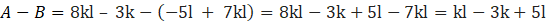 Wykonaj odejmowanie A – B, za A podstaw wyrażenie 8kl – 3k, a za B podstaw wyrażenie -5l + 7kl.