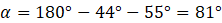 Zauważ, że skoro trójkąty są przystające, to ich kąty są identyczne. Kąt między bokami a i c w trójkącie T2 musi mieć zatem 55 stopni. Korzystając z sumy kątów trójkąta, wylicz miarę kąta α.