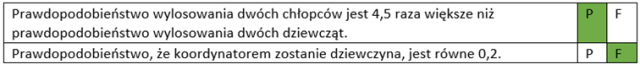 Oblicz prawdopodobieństwo wylosowania dwóch chłopców, potem dwóch dziewcząt i zauważ, że prawdopodobieństwo wylosowania dwóch chłopców jest 4,5 raza większe niż prawdopodobieństwo wylosowania dwóch dziewcząt. Prawdopodobieństwo, że koordynatorem zostanie dziewczyna jest równe