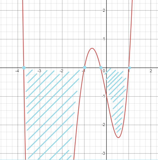 Współczynnik przy najwyższej potędze (parzystej) jest dodatni, więc wykres zaczynamy rysować z lewej górnej części układu współrzędnych. Wykres przecina oś w punktach -1, 1,