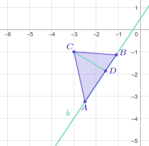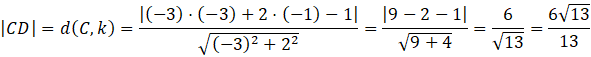 Odcinek CD jest prostopadły do prostej k. Jest on także wysokością trójkąta ABC, a jego długość można obliczyć ze wzoru na odległość punktu od prostej: