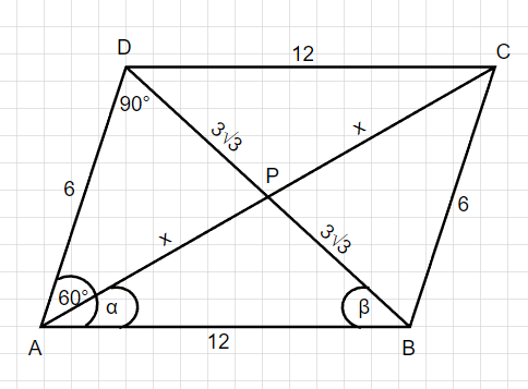 W tym zadaniu musisz obliczyć sinusy kątów ostrych trójkąta ABP, wiedząc że punkt P jest punktem przecięcia przekątnych równoległoboku ABCD. Kąt BAD ma miarę