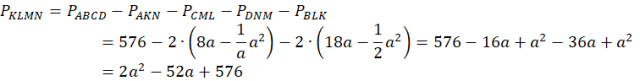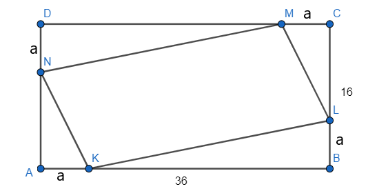 Mamy prostokąt ABCD o bokach długości |AB| = 36 cm i |BC| = 16 cm. Punkty K, L, M, N położone są na bokach prostokąta ABCD tak, że |AK| = |BL| = |CM| = |DN| = a cm. Wskaż, dla jakiej wartości a pole czworokąta KLMN ma najmniejszą wartość.
