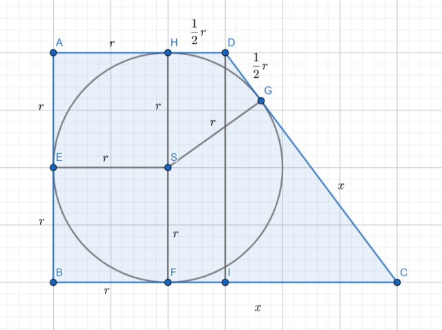 Wprowadź oznaczenia takie jak na rysunku powyżej, korzystając z twierdzenia o odcinkach stycznych. Skorzystaj z tw. Pitagorasa, aby obliczyć zależność między odcinkami x i r. Wstaw długości podstaw i wysokości trapezu do wzoru na pole.