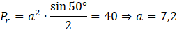 Oblicz długości przekątnych rombu, zachowując dokładność do jednego miejsca po przecinku, przy założeniu, że pole rombu wynosi 40, a miara kąta ostrego wynosi 50°.