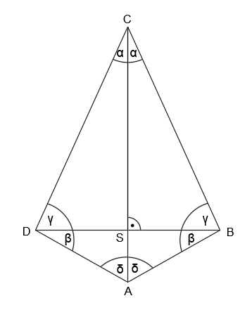 Wypisz pary trójkątów przystających, które powstały w wyniku przecięcia przekątnych AC i BD w deltoidzie ABCD.