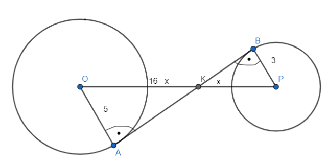 Mamy dwa okręgi: jeden o promieniu 5 i środku w punkcie O, a drugi o promieniu 3 i środku w punkcie P. Odcinek OP ma długość 16. Prosta AB jest styczna do obu okręgów w punktach A i B, a także przecina odcinek OP w punkcie K (zob. rysunek). Wskaż długość |OK|.