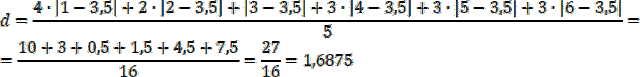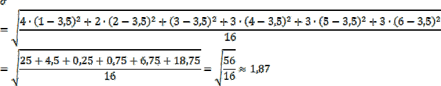 Na podstawie diagramu oblicz średnią arytmetyczną, odchylenie standardowe i odchylenie przeciętne wyników serii rzutów kostką.