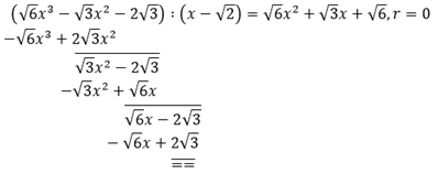 Wykonaj dzielenie pisemne dla każdego a i sprawdź, w którym rozwiązaniu reszta jest liczbą wymierną. Aby podzielić jeden wielomian przez drugi, należy podzielić pierwszy jednomian przez pierwszy wyraz dzielnika. Wynik zapisz po znaku równości. Teraz wykonaj operację odwrotną, czyli pomnóż pierwszy wyraz dzielnika przez wyraz po znaku równości i zmień znak na przeciwny. Tak samo zrób dla każdego wyrazu dzielnika, zmieniając ich znaki na przeciwne. Wynik zapisuj pod wielomianem, który jest dzielony. Teraz tak jak w dzieleniu pisemnym wykonaj dodawanie pod kreską. Wykonaj redukcję, dodając jednomiany tego samego stopnia. Powtarzaj czynność aż do uzyskania wyrazu wolnego, który będzie resztą z dzielenia. Wyraz wolny to liczba lub wyrażenie o mniejszej potędze niż najwyższa potęga dzielnika.