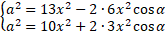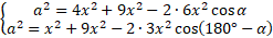 Wyznacz cosinus kąta alfa z układu równań opartego o twierdzenie cosinusów.