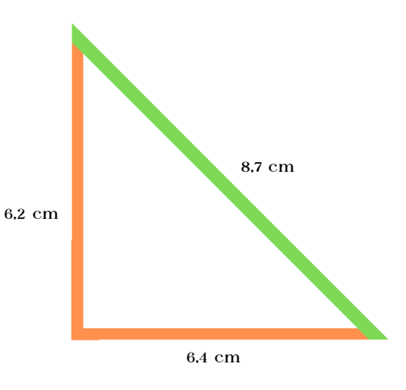 Przeciwprostokątna jest to bok leżący naprzeciwko kąta prostego (zaznaczona na zielono). Przyprostokątne to boki leżące przy kącie prostym (zaznaczone na pomarańczowo). Obwód obliczysz, dodając wszystkie długości boków.