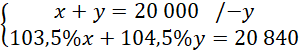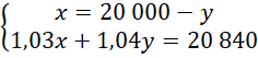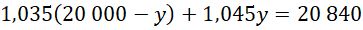 Ustal, jaką kwotę wpłacono do banku X, a jaką do banku Y, jeśli kwotę 20 000 zł zainwestowano w dwie różne lokaty roczne oferowane przez bank X i bank Y, lokata w banku X oprocentowana była 3,5% w skali roku, oprocentowanie lokaty w banku Y było o 1 punkt procentowy wyższe, a po roku wypłacono z lokat 20 840 zł.