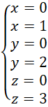 Wyznacz równania płaszczyzn zawierających ściany prostopadłościanu o wierzchołkach: (0,0,0), (0,2,0), (1,0,0), (1,2,0), (0,0,3), (0,2,3), (1,0,3), (1,2,3).