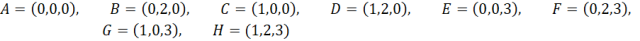 Wykonaj rysunek pomocniczy. Zaznacz w trójwymiarowym układzie współrzędnych poniższe punkty, które utworzą prostopadłościan.