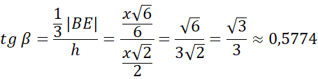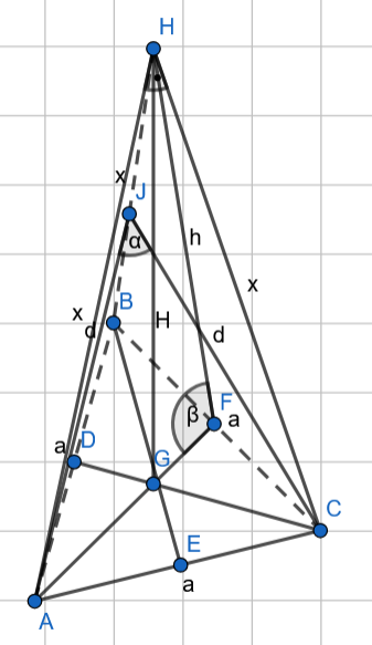 Na początku zauważ, że podany ostrosłup zawiera się w sześcianie – podstawa przechodzi przez trzy wierzchołki zawierające przekątne ścian bocznych mające wspólny wierzchołek, więc kąt między ścianami bocznymi jest kątem prostym.