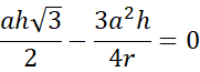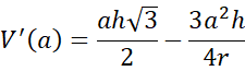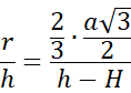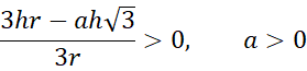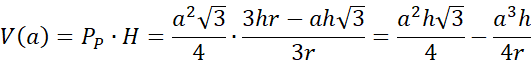 Z zależności długości promienia oraz wysokości całego stożka i górnego stożka wyznacz długość wysokości graniastosłupa, a następnie określ dziedzinę – wysokość i krawędź muszą być dodatnie. Następie oblicz objętość graniastosłupa – zauważ, że powstanie funkcja zmiennej