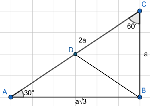 Zauważ, że trójkąt prostokątny o podanych kątach jest szczególny – długość boku naprzeciwko największego kąta jest dwa razy większa od długości boku naprzeciwko najmniejszego kąta, a długość boku leżącego naprzeciwko środowego kąta jest