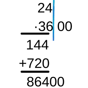 Żeby policzyć liczbę sekund w dobie, należy liczbę sekund w godzinie pomnożyć przez liczbę godzin w dobie. Jeśli przy wykonywaniu mnożenia liczby mają zera na końcu, to możesz te zera wpisać za kreską i wykonać mnożenie bez nich, a na końcu do wyniku dopisać tyle zer, ile jest za kreską. Wykonując mnożenie pisemne przez liczbę wielocyfrową, należy najpierw pomnożyć cyfrę jedności liczby, przez którą mnożysz, przez cyfrę jedności drugiej liczby. Jeśli otrzymana liczba jest dwucyfrowa, należy cyfrę jedności takiego wyniku zapisać pod słupkiem cyfr jedności, a cyfrę dziesiątek z wyniku trzeba przenieść dalej poprzez dopisanie tej cyfry nad kolejnym w lewo słupkiem, czyli słupkiem cyfr dziesiątek. Przy mnożeniu kolejnego słupka, do wyniku dodaje się przeniesioną cyfrę ze słupka wcześniej. W taki sam sposób należy mnożyć każdą kolejną cyfrę, zaczynając od lewej i idąc do prawej. Jeśli w ostatnim słupku wyjdzie liczba większa od 10, to już nie wolno przenosić dalej, bo nie ma kolejnego słupka, lecz należy napisać całą liczbę. Po pomnożeniu przez cyfrę jedności należy wykonać te same operacje, mnożąc przez kolejne cyfry, zaczynając od dziesiątek. Z każdą kolejną cyfrą, przez którą mnożysz w sekcji dodawania, dopisuj z prawej strony jedno zero. Na końcu wykonaj dodawanie pisemne. Dodawaj kolejno każdy ze słupków, począwszy od jedności, a gdy po dodaniu wynik będzie dwucyfrowy, to liczbę jedności zapisz pod tym słupkiem, a liczba dziesiątek przejdzie dalej do następnego słupka.