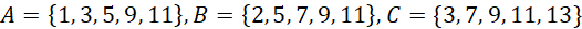 Przeanalizuj zbiory A, B i C oraz podany zbiór, który masz przedstawić. Zauważ, że elementy w nim obecne występują jednocześnie zbiorach A, B i C a inne elementy tych zbiorów nie. Oznacza to, że część wspólna tych zbiorów to dokładnie taki zbiór, który chcemy opisać.