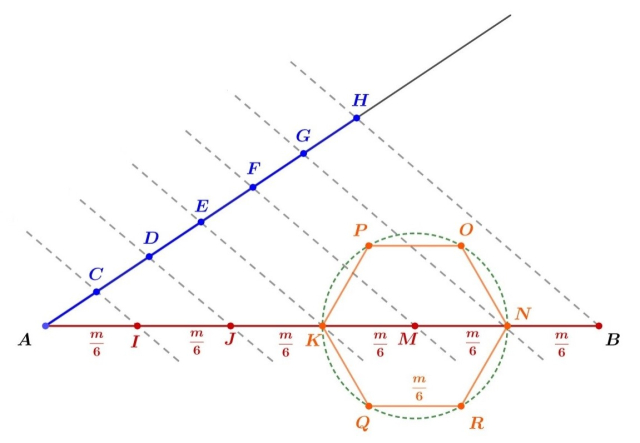 6. Z twierdzenia Talesa wynika, że każdy z odcinków AI, IJ, JK, KM, MN, NB mają równe długości wynoszące