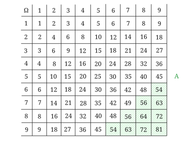 Dany jest zbiór cyfr {1, 2, 3, 4, 5, 6, 7, 8, 9}. Tworzymy liczbę dwucyfrową, losując dwukrotnie ze zwracaniem z danego zbioru. Wyznacz prawdopodobieństwo utworzenia liczby, której iloczyn cyfr jest większy od 50.