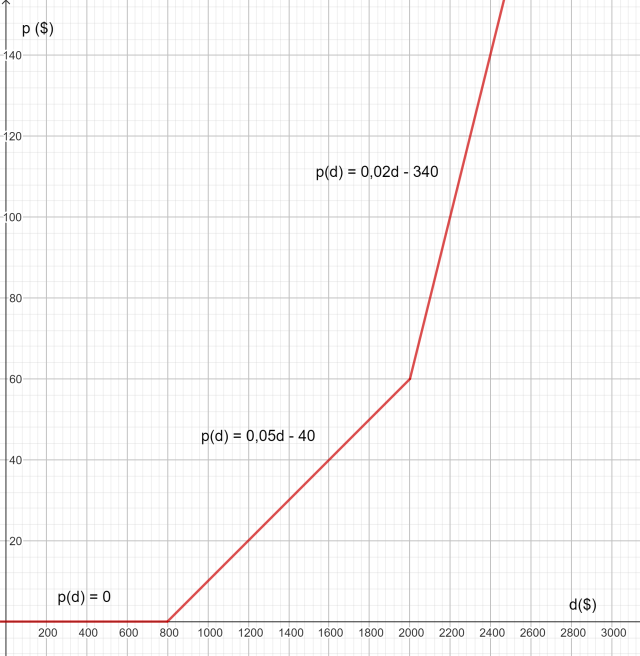 W pewnym kraju, dochody nieprzekraczające 800 dolarów są zwolnione od podatku dochodowego. Jeżeli dochód przekracza 800 dolarów, ale nie przekracza 2000 dolarów, podatnik płaci 5% podatku od nadwyżki ponad 800 dolarów. Jeśli dochód przekracza 2000 dolarów, podatnik płaci stałą kwotę 60 dolarów oraz 20% podatku od nadwyżki powyżej 2000 dolarów. Narysuj wykres funkcji.