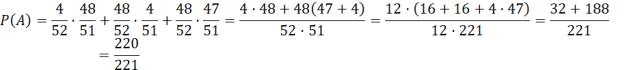 Wyznacz prawdopodobieństwo, że wśród wylosowanych kart co najwyżej jedna jest asem, mając standardową talię kart, z której losujemy dwa razy po jednej karcie bez zwracania.