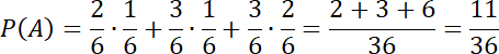 Wykonaj drzewo prawdopodobieństwa – na każdym poziomie zapisz możliwy wynik rzutu kością i prawdopodobieństwo z jakim może wypaść. Następnie wypisz wszystkie liczby sprzyjające podanemu zdarzeniu sumując iloczyny prawdopodobieństw dla każdej z liczb.