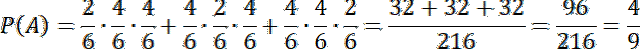 Wykonaj drzewo prawdopodobieństwa – na każdym poziomie zapisz możliwy wynik rzutu kością i prawdopodobieństwo z jakim może wypaść. Następnie wypisz wszystkie liczby sprzyjające podanemu zdarzeniu sumując iloczyny prawdopodobieństw dla każdej z liczb.