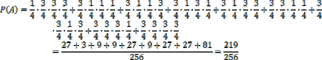 Wykonaj drzewo prawdopodobieństwa – na każdym poziomie zapisz możliwy wynik rzutu kością i prawdopodobieństwo z jakim może wypaść. Następnie wypisz wszystkie liczby sprzyjające podanemu zdarzeniu sumując iloczyny prawdopodobieństw dla każdej z liczb.