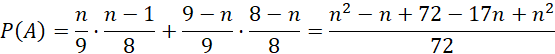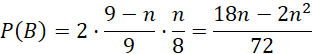 Dana jest pewna skrzynia zawierająca piłki: 𝑛 do siatkówki oraz pozostałe do koszykówki, łącznie 9. Wyznacz 𝑛 wiedząc, że prawdopodobieństwo wylosowania pary różnych piłek jest takie samo, jak prawdopodobieństwo wylosowania podobnych piłek oraz że liczba piłek do koszykówki jest mniejsza od liczby piłek do siatkówki.