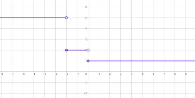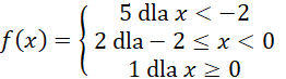 Narysuj podaną funkcję. Pamiętaj przy zaznaczaniu krańców prostej, że jeżeli punkt ten należy do dziedziny, oznaczamy go wypełnionym kółkiem, a jeżeli nie należy, oznaczamy to kółkiem niewypełnionym. Zauważ, że funkcja jest fragmentami stała, tylko przeskakuje na wartości niższe w punktach