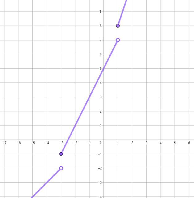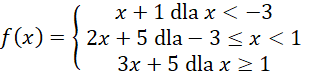 Narysuj podaną funkcję. Pamiętaj przy zaznaczaniu krańców prostej, że jeżeli punkt ten należy do dziedziny, oznaczamy go wypełnionym kółkiem, a jeżeli nie należy, oznaczamy to kółkiem niewypełnionym. Zauważ, że podana funkcja jest rosnąca w całej swojej dziedzinie.
