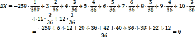 Wyznacz wartość oczekiwaną wygranej, jeśli gracz rzuca dwa razy sześcienną kostką do gry i dodaje liczby uzyskanych oczek. Uzyskany wynik stanowi wygraną gracza w złotych, z takim wyjątkiem, że jeśli wypadną dwie jedynki, to gracz przegrywa 250 zł.