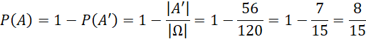 a następnie skorzystaj ze wzoru na prawdopodobieństwo klasyczne oraz prawdopodobieństwa zdarzenia przeciwnego.