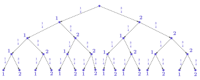 Spośród nich znajdź liczby większe lub równe 1222 i określ prawdopodobieństwo rozpatrywanego zdarzenia sumując iloczyny prawdopodobieństw przy poszczególnych rozgałęzieniach.