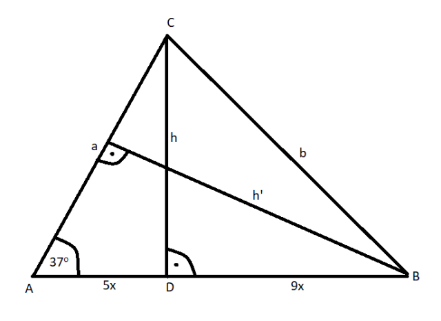 W tym zadaniu podaj, ile wynoszą pole, obwód i wysokość trójkąta ABC, w którym kąt przy wierzchołku A wynosi 37°, a bok AB ma długość 56. Dodatkowo wiadomo, że wysokość CD poprowadzona z wierzchołka C na bok AB dzieli go na części w stosunku