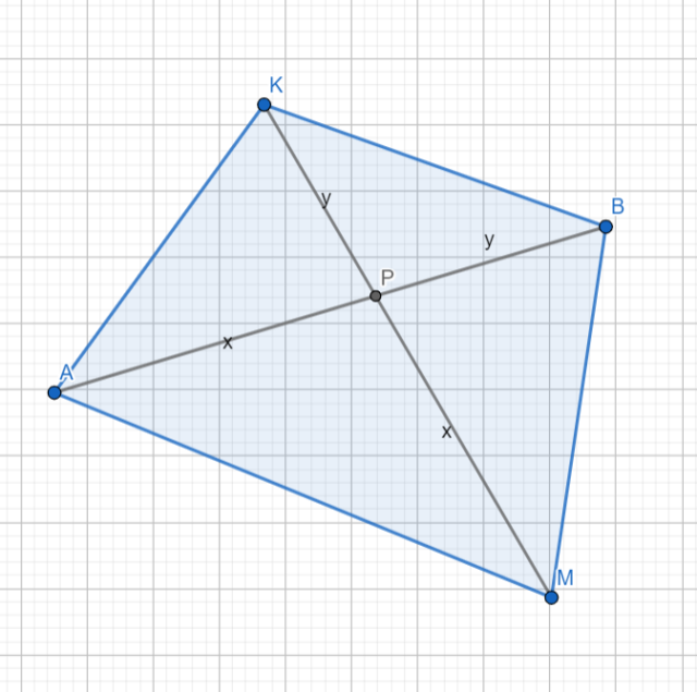 Równe odcinki AB i KM są przekątnymi czworokąta i przecinają się w punkcie P takim, że |PA|=|PM|. Wykaż, że na tym czworokącie można opisać okrąg.