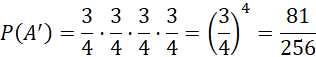 . Rzuty są 4, zatem prawdopodobieństwo zdarzenia A’ prezentuje iloczyn:
