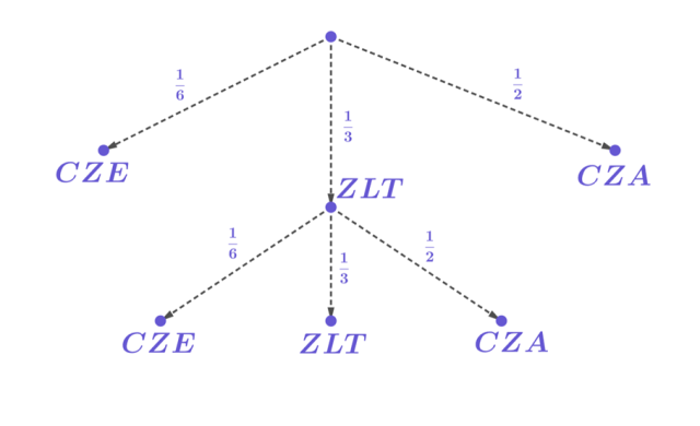 Wygranie misia następuje poprzez trafienie pola czerwonego (oznaczone jako CZE na drzewku). Są dwa zdarzenia sprzyjające zdarzeniu A: trafienie pola czerwonego za pierwszym razem; trafienie pola żółtego za przy pierwszym rzucie i czerwone przy drugim.