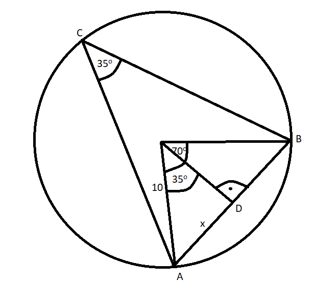 W tym zadaniu podaj, ile wynosi cięciwa AB, jeśli w kole, którego promień wynosi 10 cm znajduje się kąt wpisany wielkości 35° i jest on oparty na łuku AB. Wyniki podaj z dokładnością do drugiego miejsca po przecinku.