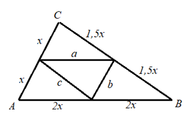 Długości boków trójkąta ABC pozostają w stosunku 2 : 3 : 4. Środki boków tego trójkąta wyznaczają trójkąt, którego obwód jest równy 13,5 cm. W tym zadaniu musisz obliczyć długości boków trójkąta ABC.