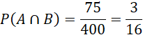 Częścią wspólną zdarzeń A i B będzie wylosowanie czekolady mlecznej z firmy C. Z tabeli można odczytać, że czekolad takich jest 75. Prawdopodobieństwo wylosowania którejś z tych 75 spośród wszystkich 400 wynosi więc: