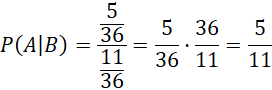 Dane są dwie 6 – ścienne kostki do gry, którymi wykonywany jest 1 rzut. Rozpatrz zdarzenie polegające na tym, że suma wyników na obu kostkach jest większa od ośmiu pod warunkiem, że na jednej z nich wypadła piątka. Wyznacz jego prawdopodobieństwo.